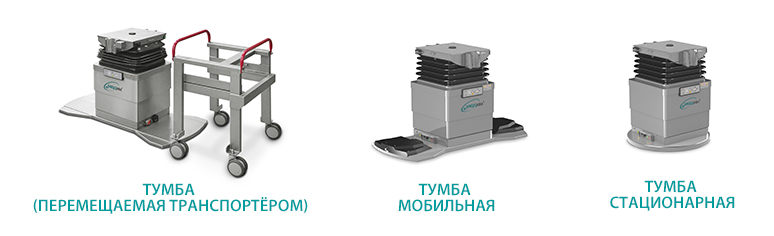 Тумбы стола разработаны для оптимизации рабочих процессов в операционных залах.- Направляющая колонна содержит электрогидравлический привод, который управляет всеми движениями панели: подъем/опускание, боковой наклон влево/вправо, наклон по Тренделенбургу и анти-Тренделенбургу.