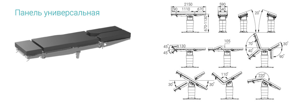 Стол ОМ-СИГМА может использоваться с тремя видами панелей: универсальной, специальной, диагностической. Разнообразие панелей позволяет использовать системные столы в разных направлениях хирургииУниверсальная панель состоит из головной, спинной, центральной (тазобедренной) и ножной секций. Панель стола – рентгенопрозрачна. На панели предусмотрены боковые направляющие для крепления принадлежностей. Управлением от пульта продольным сдвигом и наклоном спинной секции.